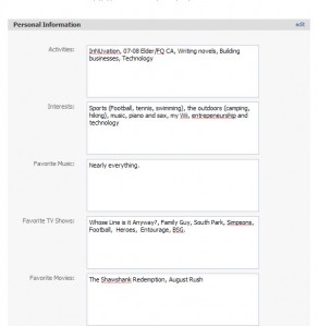 As you see, there are five tabs. But from what I’ve heard, you can actually have up to eight. Three additional tabs can be added to feature your favorite Facebook applications. A HUGE Scrabbulous fan? Make it into an easy-to-click tab. Big on photos and videos? Give FriendQuilts prominent placement.
