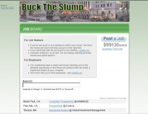 This is why I am launching a new website and blog on Monday, May 5th, called Buck the Slump. It is a blog on the recession and how to better succeed within it. The side images are screenshots from the website. The first one is an article page; the second one is the job board, where people can search for jobs or submit them.
