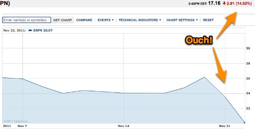 Groupon Now hasn’t taken off the way the company wanted it to, and the antics of its CEO aren’t helping. I really, really hope they can mastermind a turnaround, but my prediction is that Groupon isn’t even close to the bottom yet.