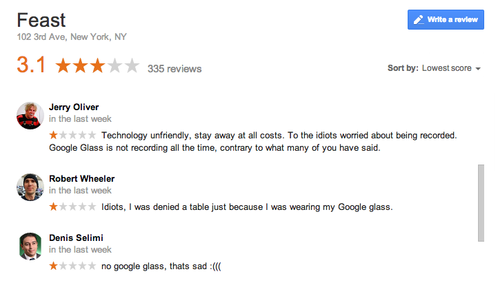 These were the only words I could muster after reading about how a group of Glass users destroyed the Yelp rating of a local NYC restaurant, all because they asked one person to take off her Google Glass in their restaurant.